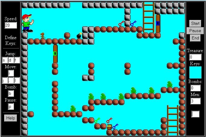 BOB is a full-function arcade game, using the keys seen at the left (which you can redefine). BOB is programmed entirely in HTML/JavaScript and has 36 different screens and 3 different enemies, 2 of which move. The image at the left shows keys and doors, which are dynamic---once you get them, they're gone (until the next game!). Try BOB out, or read more about creating Bob in the About and What's New section.